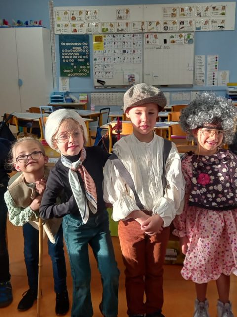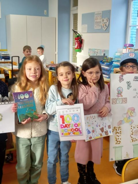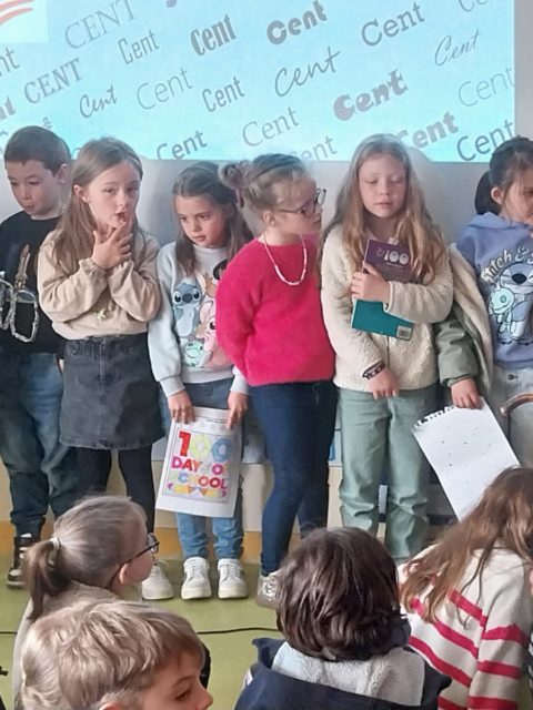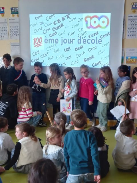 Vendredi 4 avril, nous avons fêté le centième jour d’école. Pour l’occasion, les élèves de la GS au CM2 ont pu venir déguisés ou apporter une réalisation en lien avec le nombre 100.