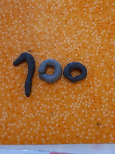 Les GS/CP ont écouté et regardé une histoire sur les cent premiers jours de classe d’une école. Les GS ont formé le nombre 100 en pâte à modeler, alors que les CP ont reçu un cahier avec différentes activités, comme se dessiner à l’âge de 100 ans ou des points à relier jusqu’à 100 pour former un dessin.