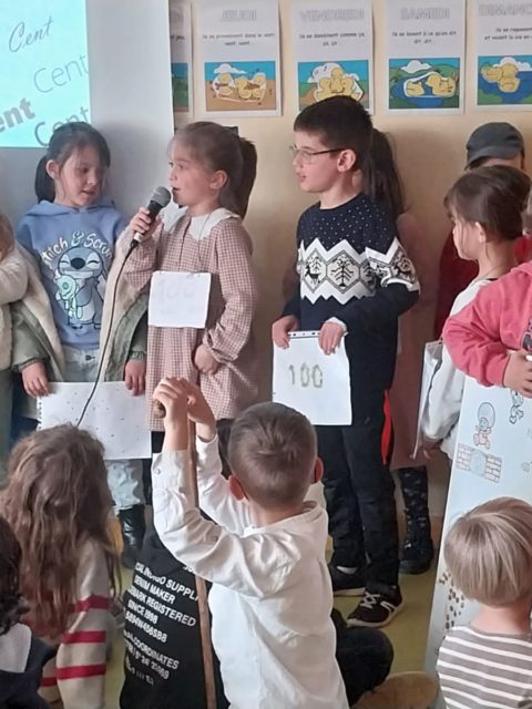 Par groupes, les CE ont réalisé des défis : construire une phrase avec 100 lettres, un petit bac avec 100 mots ou encore des défis sportifs à effectuer en 100 minutes.
