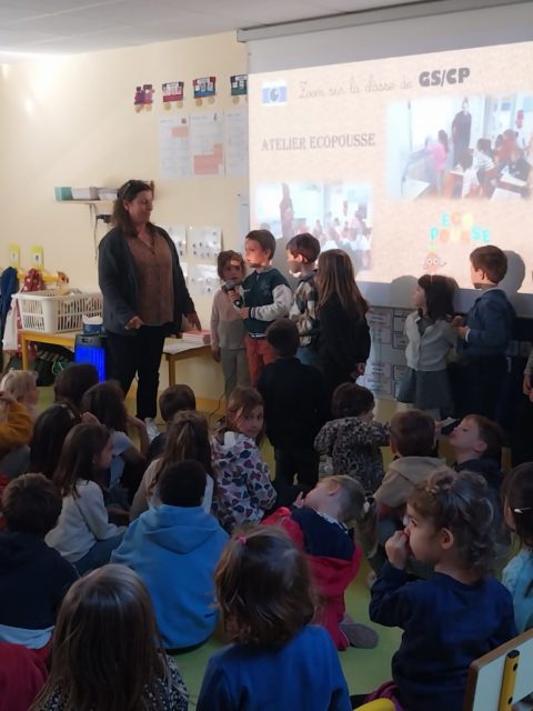 •Les GS/CP ont raconté leur atelier “écopousse”.