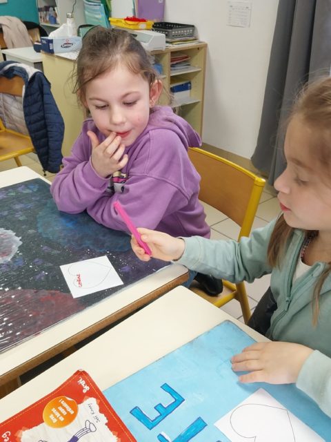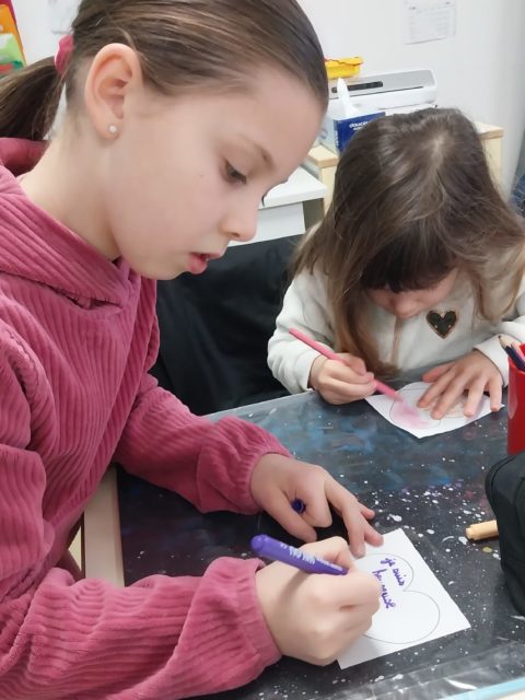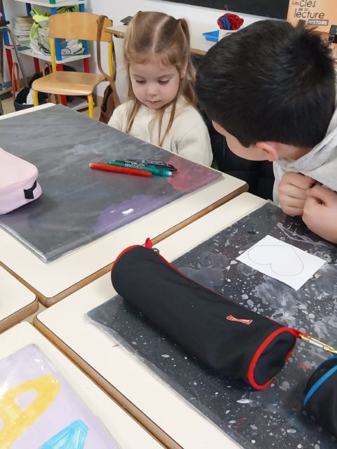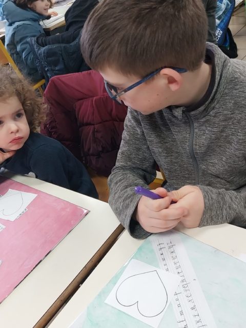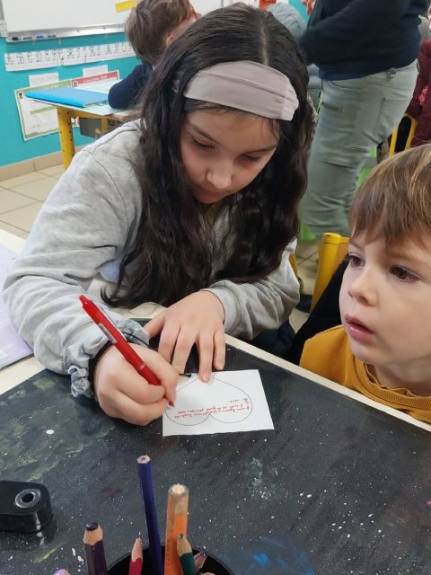 Un atelier de production d’écrits autour des émotions a donné lieu à la création de cœurs destinés à compléter la fresque extérieure de l’école. Les plus grands ont accompagné les plus jeunes en mettant par écrit leurs paroles, favorisant ainsi la coopération.