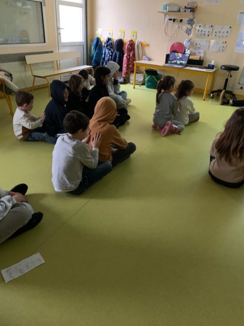 Un atelier massage en binômes a permis aux enfants de se détendre et de prendre soin les uns des autres : un grand massait le dos d’un petit, puis les rôles étaient inversés.